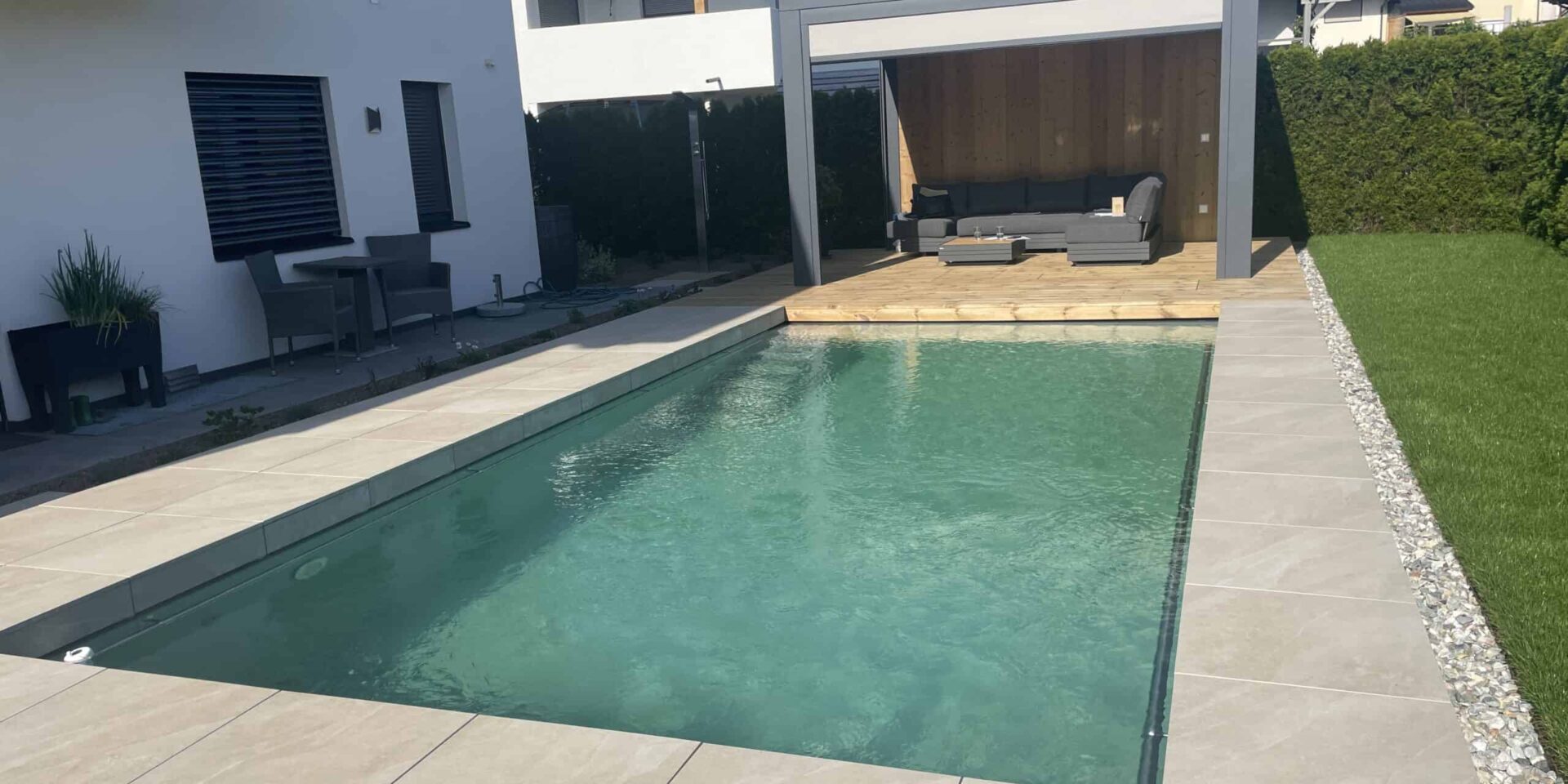 In diesem Garten verlangte der Kunde den Bau eines Schwimmbads. Dabei kam allerdings nur ein 100% natürlicher Pool in Frage, da seine Kinder allergisch auf Chemikalien reagierten. Das Ergebnis war ein natürliches grautfarbenes PVC-Betonbecken, ausgestattet mit der RABAGS® Filtertechnik, einer antialgiziden Unterflur-Solarrollabdeckung und einer Wärmepumpe für Naturpools. Der RABAGS®Naturpool wurde 10 cm über das Rasenniveau gehoben um das Einschwemmen von Nährstoffen aus der Gartenlandschaft zu verhindern. Der RABAGS®Kiesfilter ist unter den Feinsteinplatten versteckt. Abdeckung, Pumpen und Trafoschacht sind unter dem Holzdeck verbaut.